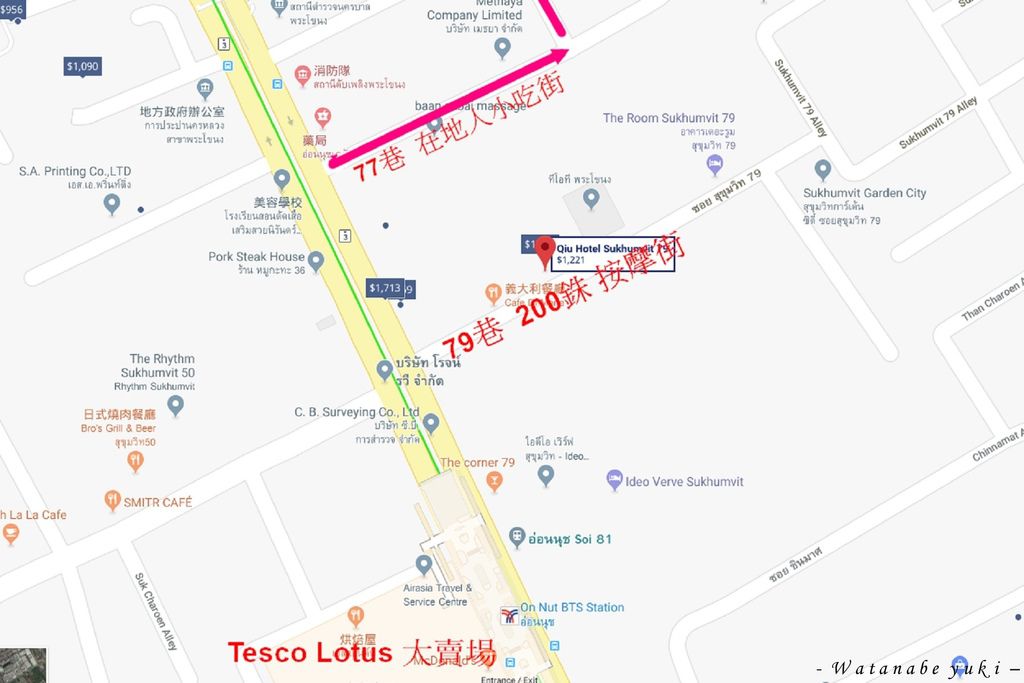 地點位在平價按摩街Sukhumvit79巷旁,設施有撞球間、健身房、泳池,附近還有連鎖量販店TESCO/LOTUS,鄰近也有在地人黃昏市場小吃攤販、7-11.